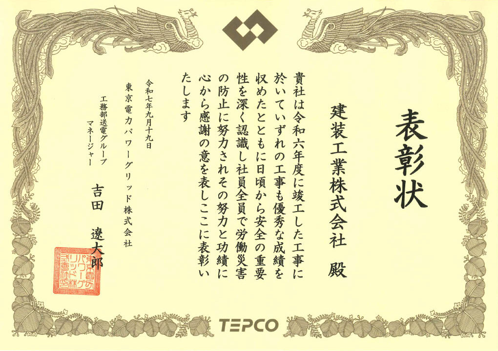 表彰団体 東京電力パワーグリット株式会社 表彰団体URL - 安全表彰(無災害)