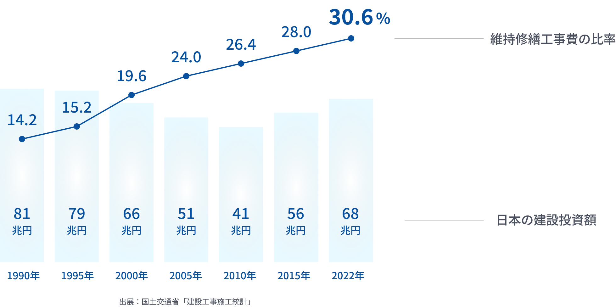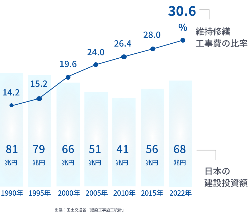 日本の建設市場においては、リニューアル工事(維持修繕工事費)が建設業全体に占める割合は年々増加をしています。